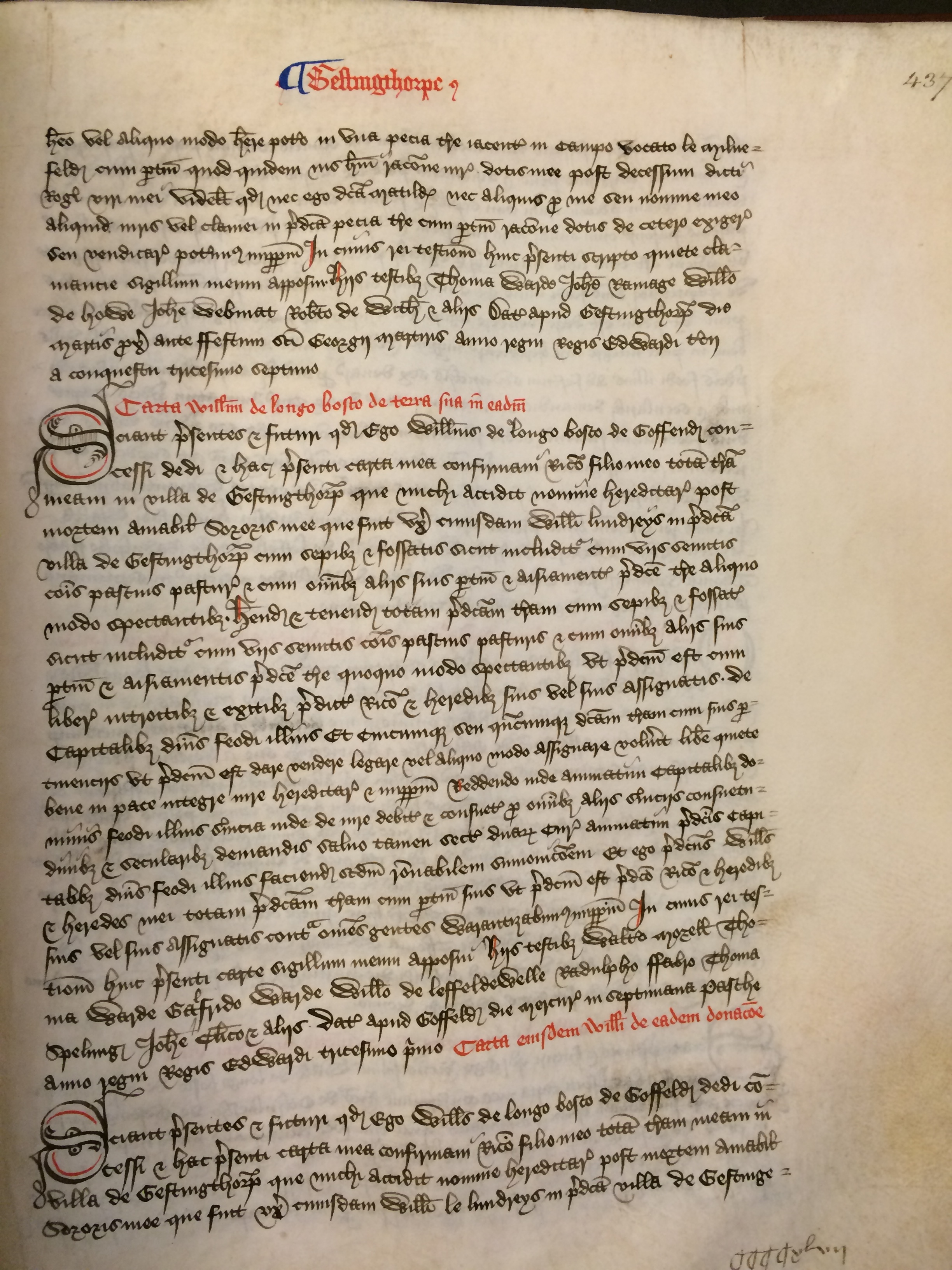 Omnibus Christi fidelibus ad quos presens scriptum pervenerit Emma atte Longewode uxor quondam Willelmi atte Longewode salutem in Domino Noveritis me in pura viduitate mea concessisse remisisse et omnino pro me [et] heredibus et assignatis meis imperpetuum quietum clamasse Ricardo de Othelesho et Avicie uxori sue et heredibus predicti Ricardi et suis assignatis totum ius et clameum quod habui vel aliquo titulo iuris vel possessionis de cetero habere potero in tota terra vocato Londereyslond quam actenus tenuit predictus Willelmus quondam vir meus in villa de Gestingthorpe ita quod nec ego dicta Emma nec heredes mei nec aliquis nomine meo vel nomine nostro aliquid de predicta terra nec de aliquibus suis pertinentiis versus predictum Ricardum Aviciam vel heredes seu assignatos ipsius Ricardi de cetero exigere vendicare aut clamare poterimus nec debemus imperpetuum In cuius rei testimonium huic quiete clamancie sigillum meum apposui Hiis testibus Matheo belewe Thoma Edward Waltero Morell Iohanne atte Hide Ricardo de Chelmesho et aliis Datum apud Gosfeld die martis proxima post festum omnium sanctorum anno regni regis Edwardi filii regis Edwardi decimo