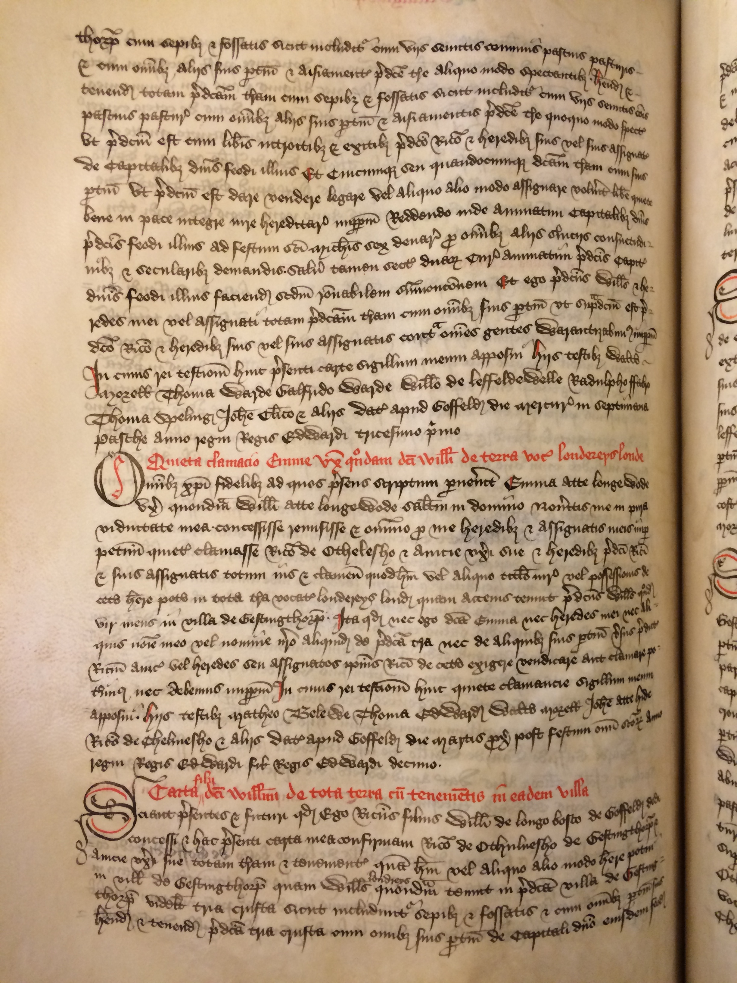 Sciant presentes et futuri quod ego Ricardus filius Willelmi de Longo bosco de Gosfeld dedi concessi et hac presenti carta mea confirmavi Ricardo de Othulvesho de Gestingthorpe et Avicie uxori sue totam terram et tenementa quam habui vel aliquo alio modo habere potui in villa de Gestingthorpe quam Willelmus Londreys quondam tenuit in predicta villa de Gestingthorpe videlicet tria crufta sicut includuntur sepibus et fossatis et cum omnibus pertinentiis suis habend et tenend predicta tria crufta cum omnibus suis pertinentiis de capitali domino eiusdem feodi predicto Ricardo et Avicie uxori sue et heredibus dicti Ricardi de Othulvesho libere quiete integre bene et in pace reddendo inde annuatim domino capitali eiusdem feodi omnia servicia et iure inde debita et consueta Et ego predictus Ricardus et heredes mei sive assignati totam predictam terram cum omnibus suis pertinentiis predictis Ricardo et Avicie uxori sue et heredibus dicti Ricardi warantizabimus acquietabimus et plenarie defendemus contra omnes gentes imperpetuum In cuius rei testimonium huic presenti carte sigillum meum apposui Hiis testibus Galfrido warde Waltero Morell Ricardo de Chelmesho Thoma warde Thoma Prudomme et aliis Datum apud Gestingthorpe die lune proxima post festum sancti Iacobi apostoli anno regni regis Edwardi filii regis Edwardi tercio