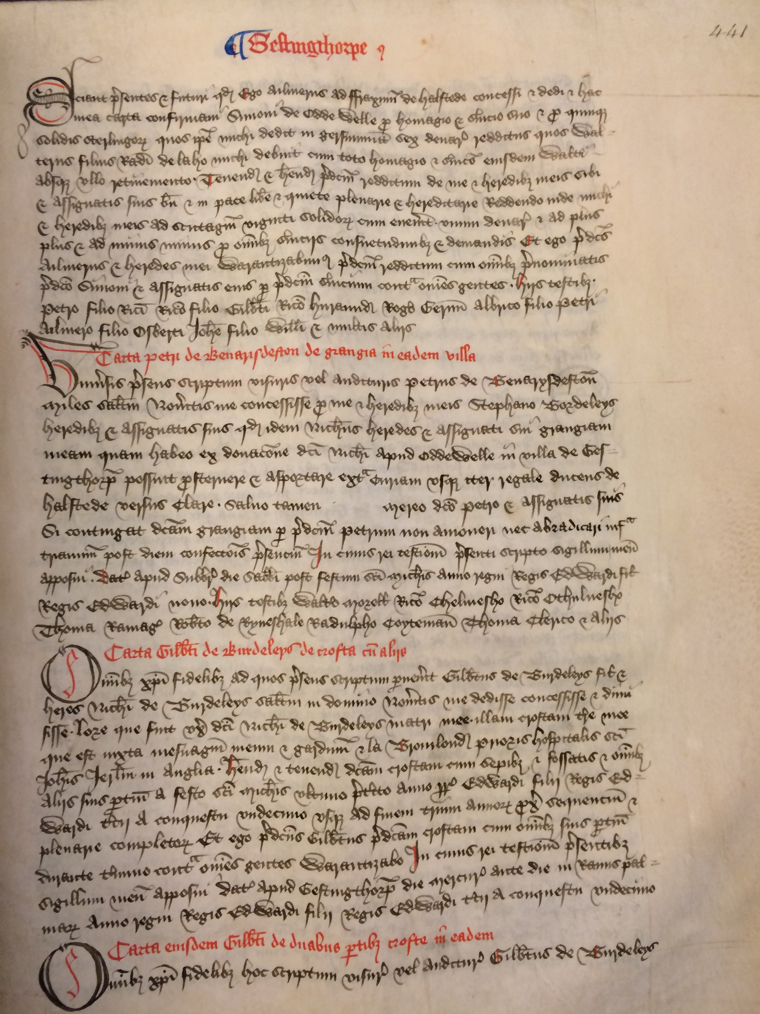 Omnibus Christi fidelibus ad quos presens scriptum pervenerit Gilbertus de Burdeleys filius et heres Nicholai de Burdeleys salutem in Domino Noveritis me dedisse concessisse et dimisisse Lore que fuit uxor dicti Nicholai de Burdeleys matri mee illam croftam terre mee que est iuxta mesuagium meum et gardinum et la Bromlond prioris hospitalis sancti Iohannis Ierusalem in Anglia habend et tenend dictam croftam cum sepibus et fossatis et omnibus aliis suis pertinentiis a festo sancti Michaelis ultimo preterito anno regni regis Edwardi filii regis Edwardi tercii a conquestu undecimo usque ad finem trium annorum proximorum sequencium et plenarie completorum Et ego predictus Gilbertus predictam croftam cum omnibus suis pertinentiis durante termino contra omnes gentes warantizabo In cuius rei testimonium presentibus sigillum meum apposui Datum apud Gestingthorpe die mercurii ante die in ramis palmarum anno regni regis Edwardi filii regis Edwardi tercii a conquestu undecimo