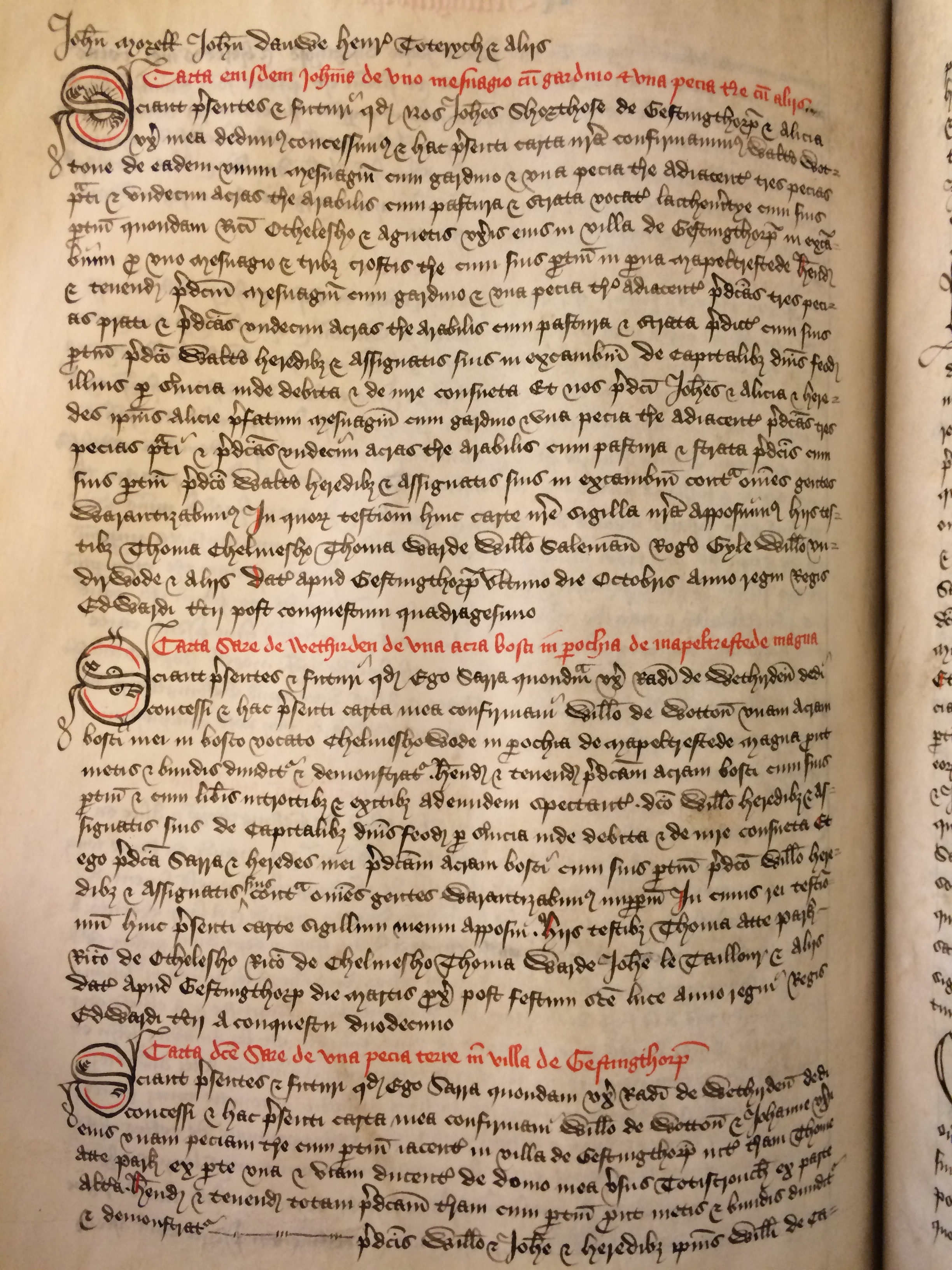 Sciant presentes et futuri quod ego Sarra quondam uxor Radulphi de Wethirden dedi concessi et hac presenti carta mea confirmavi Willelmo de Wotton unam acram bosci mei in bosco vocato Chelmeshowode in parochia de Mapeltrestede magna prout metis et bundis dividitur et demonstratur habend et tenend predictam acram bosci cum suis pertinentiis et cum liberis introitibus et exitibus ad eundem spectantibus dicto Willelmo heredibus et assignatis suis de capitalibus dominis feodi per servicia inde debita et de iure consueta Et ego predicta Sarra et heredes mei predictam acram bosci cum suis pertinentiis predicto Willelmo heredibus et assignatis suis contra omnes gentes warantizabimus imperpetuum In cuius rei testimonium huic presenti carte sigillum meum apposui Hiis testibus Thoma atte Park Ricardo de Othelesho Ricardo de Chelmesho Thoma warde Iohanne le taillour et aliis Datum apud Gestingthorp die martis proxima post festum sancti Luce anno regni regis Edwardi tercii a conquestu duodecimo