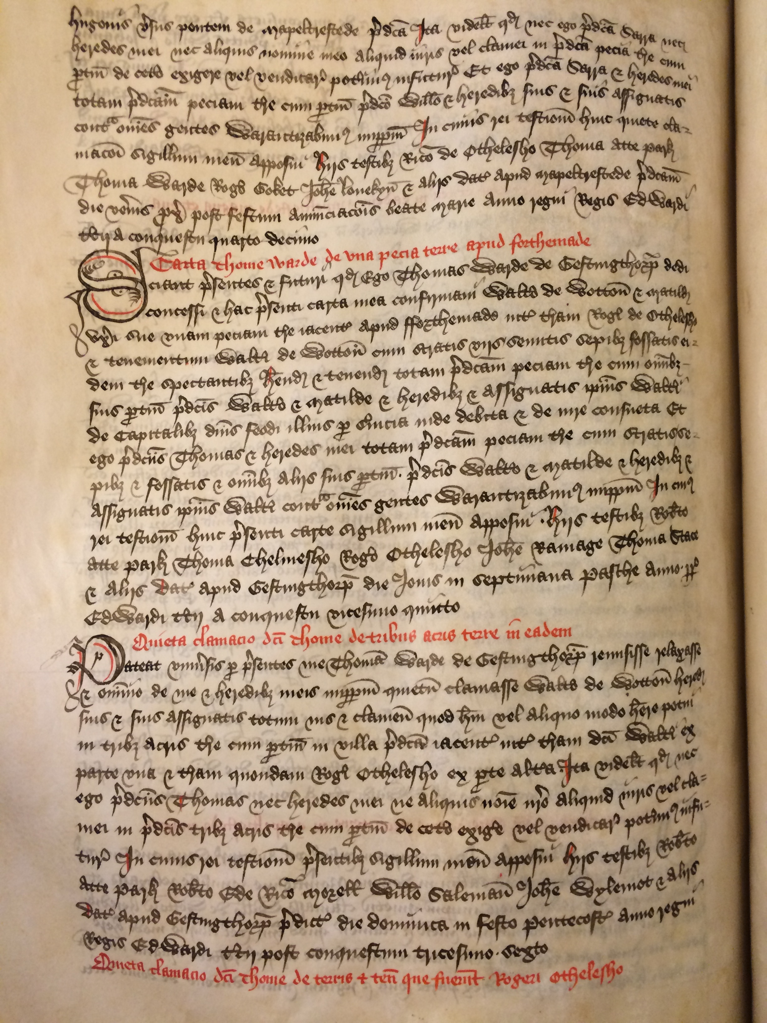 Sciant presentes et futuri quod ego Thomas warde de Gestingthorpename dedi concessi et hac presenti carta mea confirmavi Waltero de Wottonname et Matilde uxoriname sue unam peciam terre iacentis apud Forthemade inter terram Rogeri de Otheleshoname et tenementum Walteri de Wottonname cum stratis viis semitis sepibus fossatis eidem terre spectantibus habend et tenend totam predictam peciam terre cum omnibus suis pertinentiis predictis Walteroname et Matildename et heredibus et assignatis ipsius Walteriname de capitalibus dominis feodi illius per servicia inde debita et de iure consueta Et ego predictus Thomasname et heredes mei totam predictam peciam terre cum stratis sepibus et fossatis et omnibus aliis suis pertinentiis predictis Walteroname et Matildename et heredibus et assignatis ipsius Walteriname contra omnes gentes warantizabimus imperpetuum In cuius rei testimonium huic presenti carte sigillum meum apposui Hiis testibus Roberto atte Parkname Thoma Chelmeshoname Rogero Otheleshoname Iohanne Ramagename Thoma Stacename et aliis Datum apud Gestingthorpe die iovis in septimana Pasche anno regni regis Edwardi tercii a conquestu vicesimo quinto