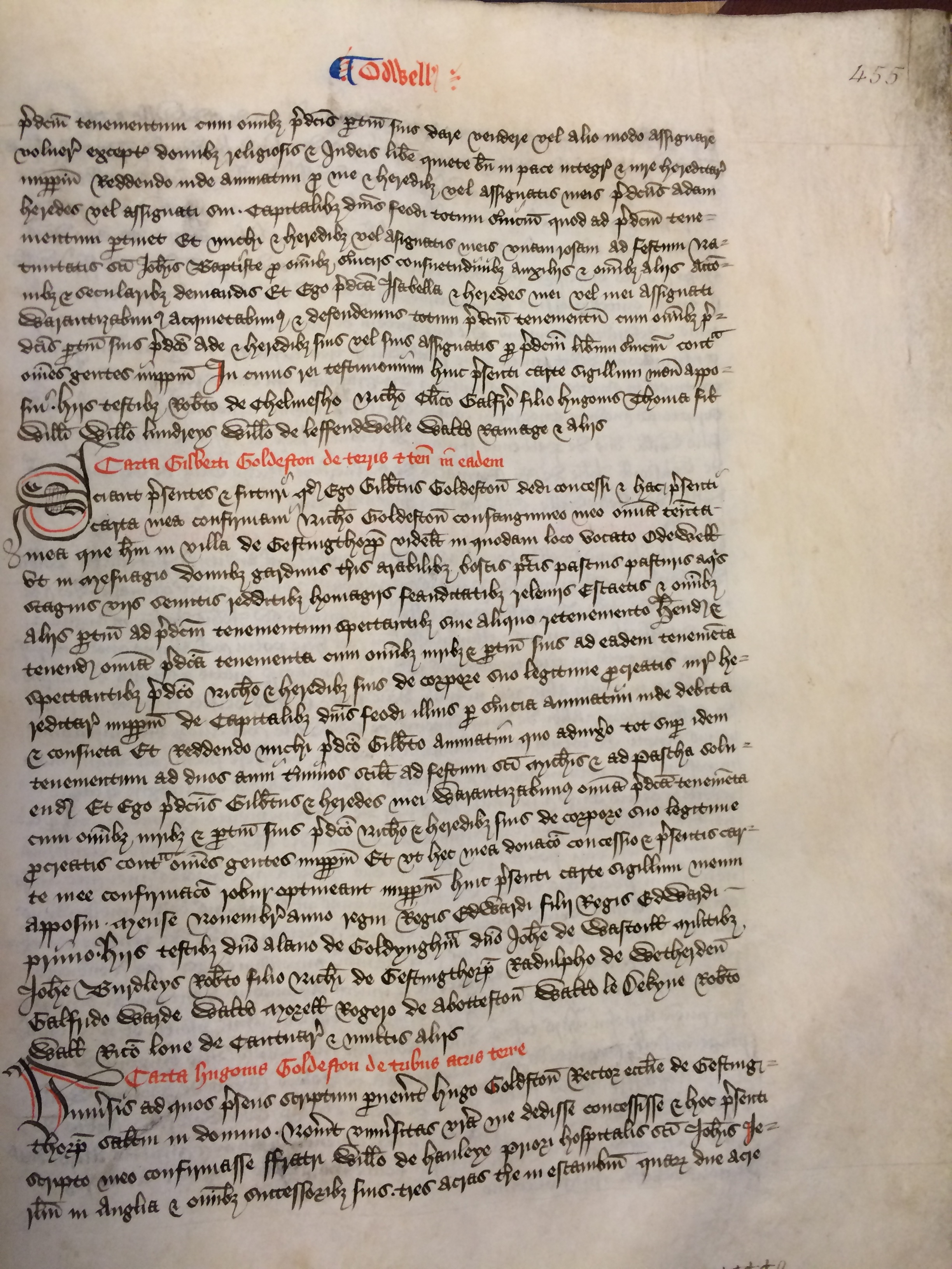 Sciant presentes et futuri quod ego Gilbertus Goldestonname dedi concessi et hac presenti carta mea confirmavi Nicholao Goldeston consanguineoname meo omnia tenementa mea que habui in villa de Gestingthorpe videlicet in quodam loco vocato Odewell ut in mesuagio domibus gardinis terris arabilibus boscis pratis pascuis pasturis aquis stagnis viis semitis redditibus homagiis feauditatibus releviis escaetis et omnibus aliis pertinentiis ad predictum tenementum spectantibus sine aliquo retenemento habend et tenend omnia predicta tenementa cum omnibus iuribus et pertinentiis suis ad eadem tenementa spectantibus predicto Nicholaoname et heredibus suis de corpore suo legitime procreatis iure hereditarie imperpetuum de capitalibus dominis feodi illius per servicia annuatim inde debita et consueta et reddendo michi predicto Gilbertoname annuatim quoad vixero tot super idem tenementum ad duosnumeral anni terminos scilicet ad festum sancti Michaelis et ad Pascha solvendum Et ego predictus Gilbertusname et heredes mei warantizabimus omnia predicta tenementa cum omnibus iuribus et pertinentiis suis predicto Nicholaoname et heredibus suis de corpore suo legitime procreatis contra omnes gentes imperpetuum Et ut hec mea donacio concessio et presentis carte mee confirmacio robur optineant imperpetuum huic presenti carte sigillum meum apposui mense novembris anno regni regis Edwardi filii regis Edwardi primo Hiis testibus domino Alano de Goldynghamname domino Iohanne de Wastoill militibusname Iohanne Burdleysname Roberto filio Nicholai de Gestingthorpename Radulpho de Wetherdenname Galfrido wardename Waltero Morellname Rogero de Abottestonname Waltero le Dekynename Roberto wallname Ricardo Loue de Cantuarname et multis aliis