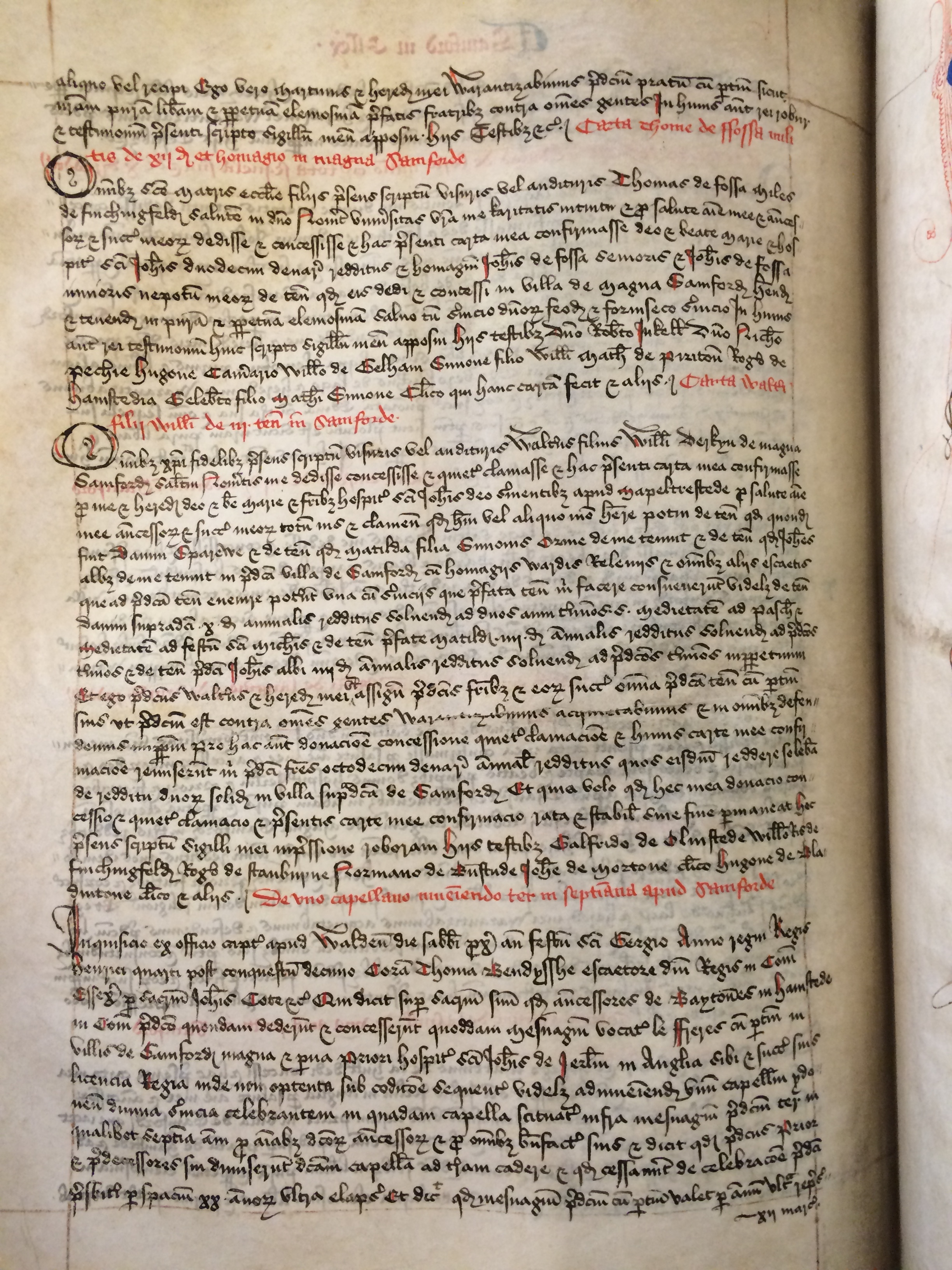 Omnibus sancte matris ecclesie filiis presens scriptum visuris vel audituris Thomas de Fossa miles de Finchingfeld[] salutem in Domino Noverit universitas vestra me karitatis intuitu et pro salute anime mee et antecessorum et successorum meorum dedisse et concessisse et hac presenti carta mea confirmasse Deo et beate Marie et hospitali sancti Iohannis [Ierusalem] duodecim denarios redditus et homagium Iohannis de Fossa senioris et Iohannis de Fossa minoris nepotum meorum de tenemento quod eis dedi et concessi in villa de magna Samford[] habendos et tenendos in puram et perpetuam elemosinam salvo tamen servicio dominorum feodi et forinseco servicio In huius autem rei testimonium huic scripto sigillum meum apposui Hiis testibus domino Roberto Inkell[] domino Nicholao Pechie Hugone camerario Willelmo de Gelham Simone filio Willelmi Matheo de Piriton[] Rogero de Hamstedia Geleberto filio Mathei Simone clerico qui hanc cartam fecit et aliis