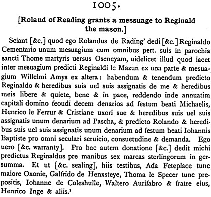 Sciant [] quod ego Rolandus de Rading dedi [] Reginaldo Cementario unum mesuagium cum omnibus pert suis in parochia sancti Thome martyris uersus Oseneyam uidelicet illud quod iacet inter mesuagium predicti Reginaldi le Mazun ex una parte et mesuagium Willelmi Amys ex altera habend et tenend predicto Reginaldo et heredibus suis uel suis assignatis de me et heredibus meis libere et quiete bene et in pace reddendo inde annuatim capitali domino feoudi decem denarios ad festum beati Michaelis Henrico le Ferrur et Cristiane uxori sue et heredibus suis uel suis assignatis unum denarium ad Pascha et predicto Rolando et heredibus suis uel suis assignatis unum denarium ad festum beati Iohannis Baptiste pro omni seculari seruicio consuetudine et demanda Ego uero [] Pro hac autem donatione [] dedit michi predictus Reginaldus pre manibus sex marcas sterlingorum in gersumma Et ut [] hiis testibus Ada Feteplace tunc maiore Oxonie Galfrido de Henxsteye Thoma le Specer tunc prepositis Iohanne de Coleshulle Waltero Aurifabro et fratre eius Henrico Inge et aliis