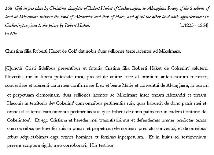[C]unctis Cristi fidelibus presentibus et futuris Cristina filia Roberti Haket de Cokerint salutem Noveritis me in libera potestate mea pro salute anime mee et omnium antecessorum meorum concessisse et presenti carta mea confirmasse Deo et beate Marie et conventui de Alvingham in puram et perpetuam elemosinam duas selliones iacentes ad Mikelmare inter terram Alexandri et terram Haconis in territorio de Cokerint cum omnibus pertinentiis suis quas habuerit de dono patris mei et omnes alias terras cum omnibus pertinentiis suis quas habent de dono patris mei in eodem territorio de Cokerinton Et ego Cristiana et heredes mei warantizabimus et defendemus omnes predictas terras cum omnibus pertinentiis suis in puram et perpetuam elemosinam predicto conventui et de omnibus rebus acquietabimus erga omnes homines et feminas inperpetuum Et in huius rei testimonium presens scriptum sigillo meo corroboravi Hiis testibus []