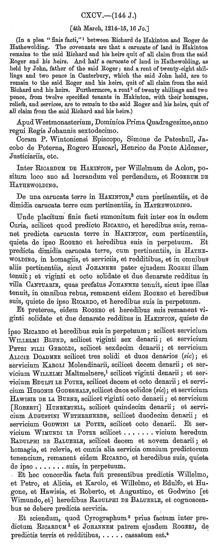 Hec est finalis concordia facta in curia domini Regis Apud Westmonasterium Dominica Prima Quadragesime anno regni Regis Johannis sextodecimo Coram P Wintoniensi Episcopo Simone de Pateshull Jacobo de Poterna Rogero Huscarl Henrico de Ponte Aldemer Justiciariis [] Inter Ricardum de Hakinton per Willelmum de Aclon positum loco suo ad lucrandum vel perdendum et Rogerum de Hathewolding De una carucata terre in Hakinton cum pertinentiis et de dimidia carucata terre cum pertinentiis in Hathewolding Unde placitum finis facti summonitum fuit inter eos in eadem Curia scilicet quod predicto Ricardo et heredibus suis remanet predicta carucata terre in Hakinton cum pertinentiis quieta de ipso Rogero et heredibus suis in perpetuum Et predicta dimidia carucata terre cum pertinentiis in Hathewolding in homagiis et serviciis et redditibus et in omnibus aliis pertinentiis sicut Johannes pater ejusdem Rogeri illam tenuit j et viginti et octo solidate et due denarate redditus in villa Cantuarie quas prefatus Johannes tenuit sicut ipse illas tenuit in omnibus rebus remanent eidem Rogero et heredibus suis quiete de ipso Ricardo et heredibus suis in perpetuum Et preterea eidem Rogero et heredibus suis remanent viginti solidate et due denarate redditus in Hakinton quiete de ipso Ricardo et heredibus suis in perpetuum scilicet servicium Willelmi Blund scilicet viginti sex denarii et servicium Petri filii Geroldi scilicet sexdecim denarii et servicium Alicie Doadmer scilicet tres solidi et duos denarios et servicium Karoli Molendinarii scilicet decem denarii et servicium Willelmi Maltmelnere scilicet viginti denarii et servicium Edulfi le Poter scilicet decem et octo denarii et servicium Hugonis Godeshalf scilicet duos solidos et servicium Hawisie de la Burne scilicet viginti octo denarii et servicium [Roberti] Huneketell scilicet quindecim denarii et servicium Augustini Wetherherde scilicet duodecim denarii et servicium Godwini le Poter scilicet octo denarii Et servicium Wimundi le Poter scilicet [] vicium heredum Radulphi de Baluerle scilicet decem et novem denarii et homagia et relevia et omnia alia servicia omnium predictorum tenencium remanent eidem Ricardo et heredibus suis quieta de ipso [] suis in perpetuum Et hec concordia facta fuit presentibus predictis Willelmo et Petro et Alicia et Karolo et Willelmo et Edulfo et Hugone et Hawisia et Roberto et Augustino et Godwino [et Wimundo et] heredibus Radulphi de Baluerle et cognoscendus se debere predicta servicia Et sciendum quod Cyrographum prius factum inter predictum Ricardum et Johannem patrem ejusdem Rogeri de predictis terris et redditibus [] cassatum est