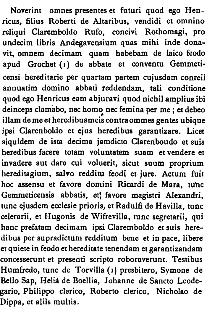 Noverint omnes presentes et futuri quod ego Henricus filius Roberti de Altaribus vendidi et omnino reliqui Claremboldo Rufo concivi Rothomagi pro undecim libris Andegavensium quas mihi inde donavit omnem decimam quam habebam de laico feodo apud Grochet de abbate et conventu Gemmeticensi hereditarie per quartam partem cujusdam conreii annuatim domino abbati reddendam tali conditione quod ego Henricus eam ab juravi quod nichil amplius ibi deinceps clamabo nec homo nec femina per me et debeo illam de me et heredibus meis contra omnes gentes ubique ipsi Clarenboldo et ejus heredibus garantizare Licet siquidem de ista decima jam dicto Clarenboudo et suis heredibus facere totam voluntatem suam et vendere et invadere aut dare cui voluerit sicut suum proprium hereditarium salvo redditu feodi et jure Actum fuit hoc assensu et favore domini Ricardi de Mara tunc Gemmeticensis abbatis et favore magistri Alexandri tunc ejusdem ecclesie prioris et Radulfi de Havilla tunc celerarii et Hugonis de Wifrevilla tunc segregari qui hanc prefatam decimam ipsi Claremboldo et suis heredibus per supradictum redditum bene et in pace libere et quiete in feodo et hereditate tenendam et garantizandam concesserunt et presenti scripto roboraverunt Testibus Humfredo tunc de Torvilla presbitero Symone de Bello Sap Helia de Boellia Johanne de Sancto Leodegario Philippo clerico Roberto clerico Nicholao de Dippa et aliis multis