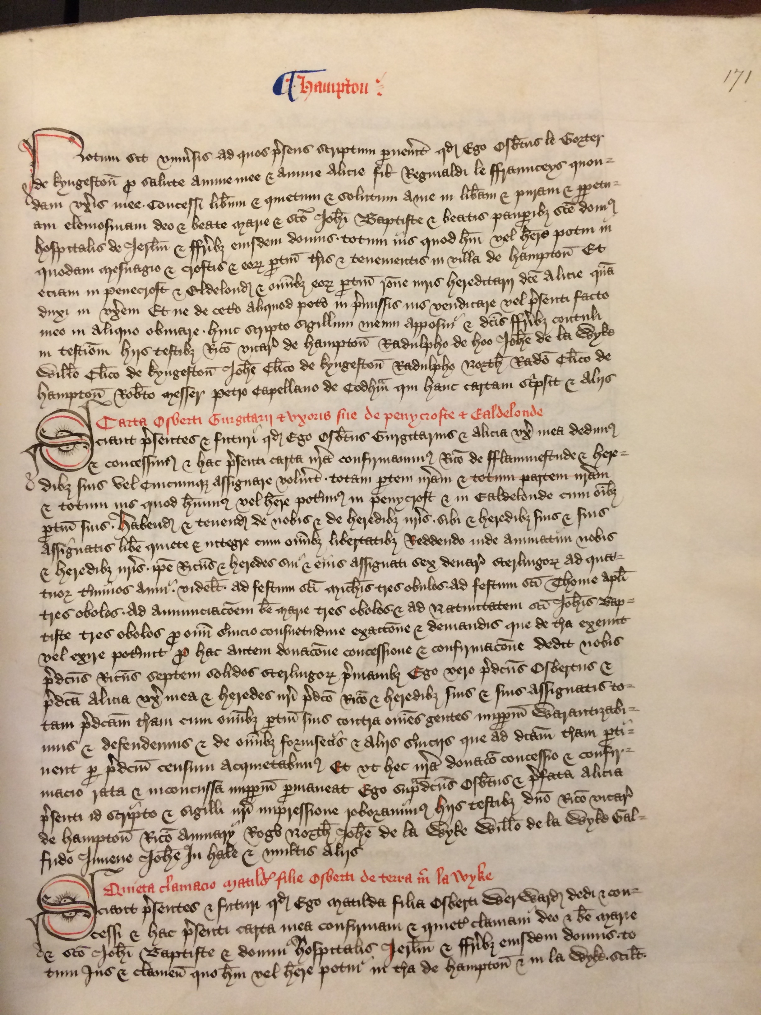 Notum sit universis ad quos presens scriptum pervenerit quod ego Osbertus le Gorter de Kyngestonname pro salute anime mee et anime Alicie filie Reginaldi le Fraunceys quondam uxoris meename concessi liberum et quietum et solutum a me in liberam et puram et perpetuam elemosinam Deo et Beate Marie et Sancto Iohanni Baptiste et beatis pauperibus Sancte domus hospitalis de Ierusalem et fratribusname eiusdem domus totum ius quod habui vel habere potui in quodam mesuagio et croftis et eorum pertinenciis terris et tenementis in villa de Hampton et eciam in penecroft et Eldelond et omnibus eorum pertinenciis ratione iuris hereditarii dicte Aliciename quam duxi in uxorem et ne de cetero aliquod potero in premissis ius vendicare presenti facto meo in aliquo obviare huic scripto sigillum meum apposui et dictis fratribusname contuli in testimonium hiis testibus Ricardo vicario de Hamptonname Radulpho de Hooname Iohanne de la Wykename Willelmo clerico de Kyngestonname Iohanne clerico de Kyngestonname Radulpho Northname Radulpho clerico de Hamptonname Roberto Messername Petro capellano de Codhamname qui hanc cartam scripsit et aliis